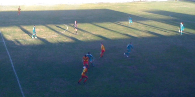 In apertura, qualche episodio da moviola. Al 7', una rete di Gisonni viene annullata per fuorigioco. Due minuti dopo, l'arbitro decide di fa proseguire su un contatto in area ospite tra Di Fiordo e Figos: palla a Masia e palla sul fondo. Al 27', locali in vantaggio con una punizione capolavoro di Angheleddu. In chiusura di primo tempo, Dimitri si salva in corner su conclusione di Masia.