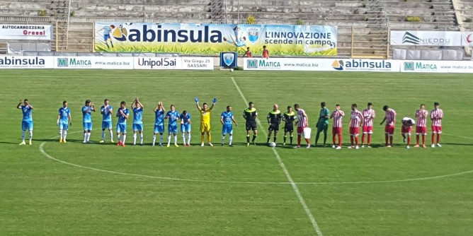 SECONDO TEMPO. Non ci sono cambi nelle due formazioni. Ammonito Puledda. Mereu pesca bene Palmas sulla sinistra, l'attaccante si accentra e prova il tiro, ma la conclusione è ribattuta. Al 49', è ancora l'ex Tergu ad avere la palla buona, ma la difesa salva ancora una volta. Cinque è particolarmente fiscale e tre minuti dopo estrae il cartellino rosso all'indirizzo di Ruggiu, seduto in panchina. Al 55', la buona fuga di Santona non si concretizza nell'assist vincente, poi però Palmas trova finalmente il meritato premio agli sforzi profusi: la sua conclusione dalla lunga distanza non lascia speranza al numero uno biancorosso, 1-1 e gara che muta il suo volto. Fideli impegna seriamente Simone al 63', Latte Dolce sempre propositivo, arbitraggio all'inglese, l'iniziativa di Missaglia sulla destra è stoppata in corner dalla retroguardia isolana: il match si accende. Al 71', Simone salva su Palmas, il ritmo si abbassa leggermente, Fiorucci sfrutta tutte e tre le sostituzioni, mentre Paba fa scaldare Pireddu, Carboni e Daga. Giallo a Mereu, Piredda rileva Puledda e Carboni per Santona, Cinque concede quattro minuti di recupero: in chiusura, Garau fa il miracolo su Dida. Finisce 1-1.