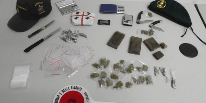 Avuta quindi la certezza dell’attività di spaccio, i finanzieri effettuavano, con le unità cinofile, un controllo a carico dei due e rinvenivano, in possesso di uno dei “venditori”, 9,2grammi di hashish confezionati all’interno di una busta di plastica, della stessa fattura di quella recuperata dall’acquirente controllato. Le ispezioni venivano quindi estese al ciclomotore nella diponibilità di uno dei due spacciatori – nel cui vano sottosella veniva trovato un coltello a serramanico intriso di sostanza stupefacente. All’interno dello stabile, le Fiamme gialle hanno rinvenuto due bilancini di precisione, 344,8grammi di hashish, 15,1grammi di marijuana divisi in venti dosi, quattro coltelli intrisi di sostanza stupefacente e 256 bustine per il confezionamento delle dosi. Le sostanze stupefacenti e gli strumenti rinvenuti sono stati sottoposti a sequestro e gli spacciatori arrestati.