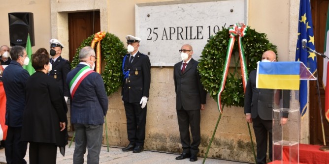L’Amministrazione comunale ha voluto che quest’anno, a fianco al tricolore, sventolasse anche la bandiera ucraina, in segno di solidarietà col popolo ucraino e con la sua resistenza. Il drappo blu e giallo è stato esposto nel balcone centrale di Palazzo Ducale e all’interno, negli spazi dedicati alla cerimonia. Erano presenti le autorità civili e militari, l’Anpi e le altre associazioni combattentistiche e d’arma e la cittadinanza.