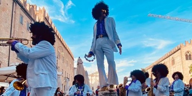 Una improbabile, sconclusionata ed esibizionista orchestra acustica e itinerante darà vita a uno spettacolo di grande impatto visivo e sonoro: tredici musicisti in coloratissimi costumi ispirati alla Febbre del sabato sera, tra occhiali a specchio, pantaloni a zampa d’elefante e pettinature esagerate, pronti a coinvolgere il pubblico con ritmo, ironia e un entusiasmo fuori controllo. Il suono incalzante di rullanti e timpani, la potenza degli ottoni, la melodia dei sax e il richiamo contagioso del disco fever accompagneranno la parata sulle note di grandi classici come I Will Survive, Hot Stuff, Sex Bomb e molti altri.