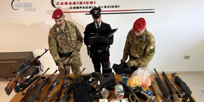 In particolare i Carabinieri, dopo aver eseguito accurati servizi di osservazione in direzione di un’abitazione sita nelle campagne di Oschiri, nel corso della mattinata di giovedì sono intervenuti sottoponendo a perquisizione l’abitazione dell’uomo, rinvenendo il seguente materiale: un fucile di precisione marca Zastava M76 cal. 8, completo di ottica e relativo serbatoio; un fucile automatico (arma da guerra) AK47 cal. 7,62; un moschetto automatico marca Beretta (arma da guerra) mod. 38/A cal. 9x19 con relativo serbatoio; una carabina a leva Erma-werke. EG712 cal. 22 con matricola abrasa; una pistola calibro 9 con relativo serbatoio e matricola abrasa; 2 pistole marca Beretta 70 cal. 7,65 mm. con relativo serbatoio e matricola abrasa; - una pistola cal. 9x21, con relativo serbatoio e matricola abrasa; una pistola Walther P38 cal. 9x19, con relativo serbatoio e matricola abrasa; - un fucile marca Franchi cal. 12 con matricola abrasa;
