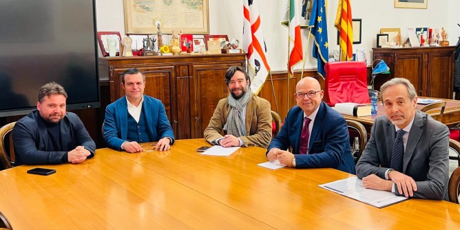 Tavolo istituzionale a Porta Terra del sindaco Raimondo Cacciotto, insieme al consigliere regionale On. Valdo Di Nolfo e all’assessore alla mobilità Roberto Corbia con l’amministratore unico e il direttore centrale di Arst, Giovanni Mocci e Carlo Poledrini