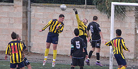 Nella foto: un’azione della partita, Fertilia in maglia giallo-blu a strisce verticali
