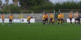 L’undici algherese è sceso in campo nella consueta divisa giallorossa, mentre gli ospiti indossavano maglia bianca e pantaloncini neri. Al primo assalto, gli ospiti battono un corner, la palla arriva a capitan Fera, che trova una pericolosa battuta di sinistro, con SuperPippoZani, che risponde da par suo, volando e deviando in calcio d’angolo. Sei minuti dopo, il capitano gallurese prova la battuta da distanza siderale, ma la palla sibila di poco alla sinistra della porta algherese. Al 9’ si vede avanti la compagine algherese, con Congiu che batte da fuori area, la palla arriva sui piedi di Andrea Peana che insacca. Ma l’arbitro Demuro, su segnalazione dell’assistente, annulla per fuorigioco. Ma passano solo tre minuti ed i giallorossi passano in vantaggio al termine di un batti e ribatti nell’area del Porto rotondo, con Addis che salva una prima volta, ma poi si deve inchinare davanti alla conclusione di Pippo Friscia. Al 23’, nuovo gol annullato per fuorigioco, stavolta dubbio a Cossu, che viene anche ammonito per aver calciato a rete dopo il fischio dell’arbitro. Sei minuti dopo, Peana entra in area sul lato destro e Modde lo atterra in modo tanto ingenuo quanto evidente e costringe il fischietto sassarese a concedere il calcio di rigore. E’ Filippo Serra, cannoniere della squadra, a presentarsi sul dischetto, ma la sua battuta in diagonale è oprevedibile e Addis devia in angolo, negandogli la decima rete stagionale. Al 38’, il folletto giallorosso ci riprova da lontano, ma non inquadra lo specchio dellaporta. E che sia una domenica no per il numero dieci si capisce a tre minuti dal riposo, quando è costretto a chiedere il cambio per un problema muscolare al flessore della coscia sinistra. Al suo posto, Calvia è costretto ad inserire Emanuele Riu, reduce da un infortunio analogo. Allo scadere, arriva il raddoppio algherese, che chiude virtualmente il match: verticalizzazione di Friscia per Peana, che evita l’uscita disperata di Addis ed insacca.