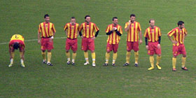 Tre minuti dopo, Alessio Cossu serve in area Levacovich, che con una finezza, elude il diretto marcatore e batte Mariano firmando il 2-0 e la sua prima doppietta in maglia giallorossa (terza rete stagionale). Al 32’, Serra su punizione dall’out mancino e Mariano sventa coi pugni. Tre minuti dopo, solita punizione di Serra dalla destra, miracolo del portiere su incornata di Congiu e, sulla respinta, Andrea Peana (che sta acquisendo personalità come centrale alla guida della difesa) viene sbilanciato da un difensore ospite, ma per l’arbitro è tutto regolare. Al 40’, Riu lavora un buon pallone sul vertice sinistro dell’area e tocca per l’accorrente Serra, che calcia sul fondo. Sessanta secondi dopo, capitan Piga scende sulla sinistra e fa partire un cross che taglia l’area. Zappino raccoglie sul lato opposto ed insacca con un potente destro. Al 43’, la conclusione di Riu dalla distanza viene deviata dalla schiena di un difensore e Mariano si supera, deviando oltre la traversa. Nel terzo minuto d recupero del primo tempo, punizione velenosa di Piga e SuperPippoZani toglie la palla da sotto l’incrocio dei pali.