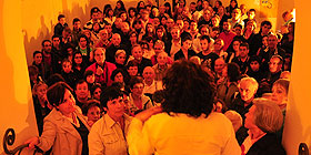 Quindi il gruppo, incuriosito - e di tappa in tappa sempre più numeroso - è stato invitato ad una passeggiata fino a raggiungere la scuola media Leonardo da Vinci (Anna Frank) dove il racconto sulla arte del Novecento è proseguito di fronte ad un rilievo ceramico, presente sulla facciata rivolta su Via E. Sacchi, realizzato da Tilocca nel 1969, pretesto per un racconto su la decorazione ceramica e l’architettura, sull’ornamento come forma di comunicazione. A quel punto ci si è diretti verso il rifugio antiaereo in Via Sassari 65.