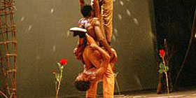 ALGHERO - «...Una gabbia di legni intrecciati sale diventa la Porta dell´inizio. Fuoco sulla ruota del Sole, la Terra dell´Albero del pane, Aria che porta un Vento, Nuvole, l´Acqua piove sulle tegole. Una rete che pesca le stelle dal mare. La Scala di spine non punge sulla rosa. Piedi a terra, piedi sulle spalle, uno sopra l´altro fino alla Luna. Alla fine la Porta dell´inizio scende e diventa una barca, l´Arca della Luce...». La sintesi di sogno e illusionismo proposta da Marcello Chiarenza introduce Creature, quarto show del palinsesto Festivalguer 2005, in programma domenica 10 luglio all´anfiteatro Forte della Maddalena, con inizio alle ore 21.00.