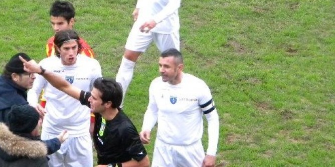 Nella foto: Massimo Demartis in maglia bianca e fascia di capitano quando giocava con l’Olbia