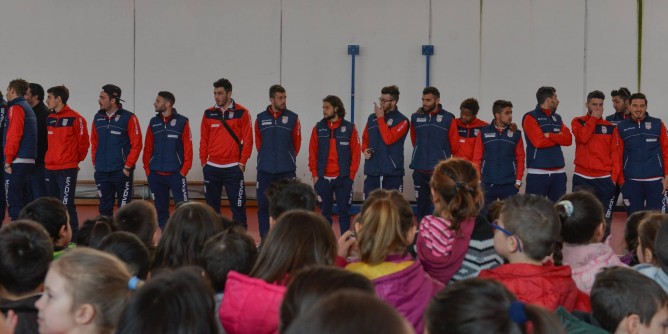Questa mattina, oltre 200 bambini delle scuole elementari e medie del Nono Circolo di Via Bottego, nel quartiere Latte Dolce di Sassari, hanno accolto i rossoblu