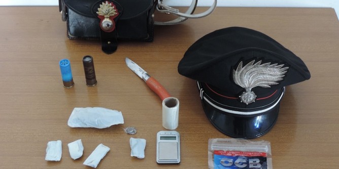 I Carabinieri hanno sequestrato due cartucce detenute illegalmente, 8grammi di marijuana e hashish, 0,65grammi di hashish, un bilancino elettronico e materiale vario per il confezionamento dello stupefacente